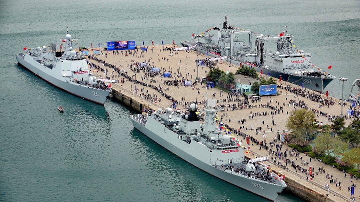 4月20日,工人在大通湖水生植物产业示范园内采收水草(无人机照片)。治理以来,当地积极发展“水草+”产业,除水草销售外,还养殖与之共生的鱼、虾、蟹类,经济效益显著提升。