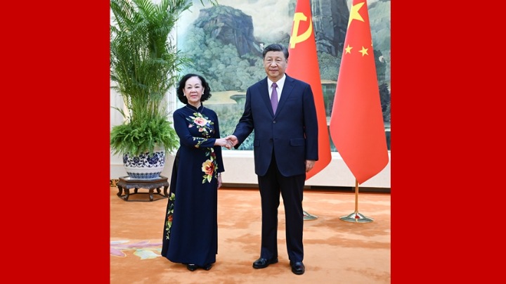 4月26日,中共中央总书记、国家主席习近平在北京人民大会堂会见越共中央政治局委员、中央书记处常务书记、中组部部长张氏梅。新华社记者 谢环驰 摄