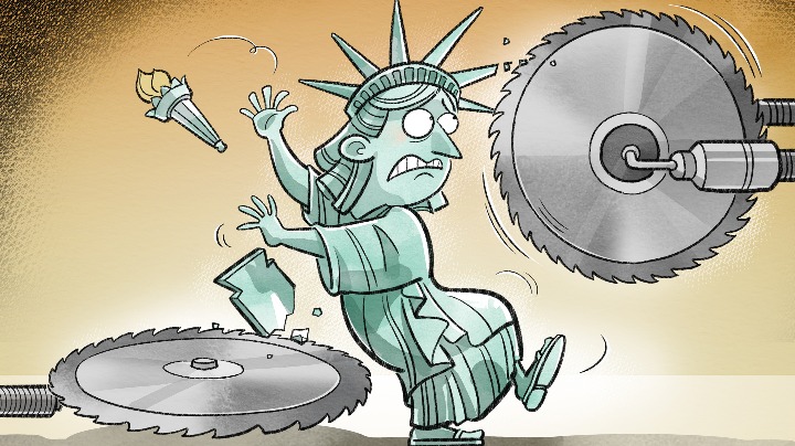 美国警方6日说,部分示威者当天对国会大厦的暴力冲击已造成4人死亡。新华社记者 刘杰 摄 1月6日拍摄的电视画面显示,美国华盛顿国会大厦内的工作人员应对闯入者。