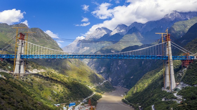 丽江至香格里拉铁路金沙江特大桥实现合龙(10月13日摄,无人机照片)。随着最后一段重达640吨的钢桁梁吊装到位,由中国中铁二院设计、中国中铁大桥局承建的丽江至香格里拉铁路金沙江特大桥13日实现合龙,为丽香铁路如期通车打下了坚实基础。