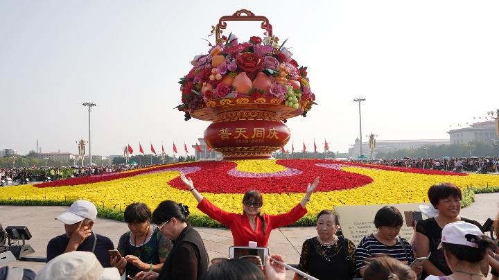 这是10月2日拍摄的天安门广场中心花坛。10月2日清晨,当人们还沉浸在新中国成立70周年庆祝活动带来的喜悦和振奋时,以“花果篮”为主造型的中心花坛亮相天安门广场,与长安街上的12座主题花坛一起,将天安门广场和长安街沿线点缀得分外靓丽。此次花篮组装工作仅用了7个小时,创造了天安门广场花卉布置的新纪录。