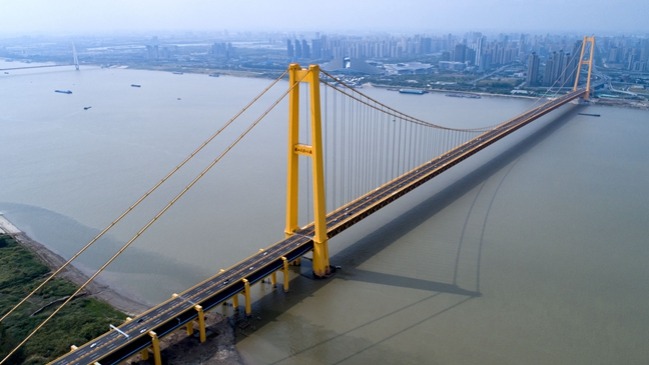 10月8日,武汉杨泗港长江大桥正式通车(无人机拍摄)。大桥上层为城市快速路,双向6车道,设计行车时速80公里;下层为城市主干道,双向6车道,设计行车时速60公里。大桥上层为城市快速路,双向6车道,设计行车时速80公里;下层为城市主干道,双向6车道,设计行车时速60公里。