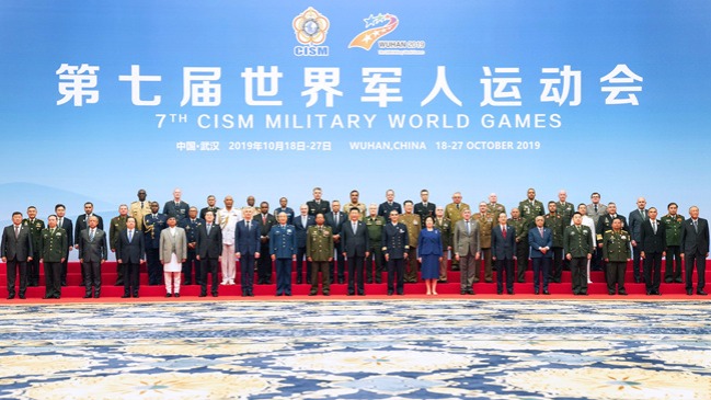10月18日下午,中共中央总书记、国家主席、中央军委主席习近平在武汉集体会见应邀出席第七届世界军人运动会开幕式的各国防务部门和军队领导人及国际军事体育理事会主要官员,代表中国政府、中国人民和中国军队向出席活动的各国防务部门和军队领导人、国际军事体育理事会官员、各国运动员表示热烈欢迎。
