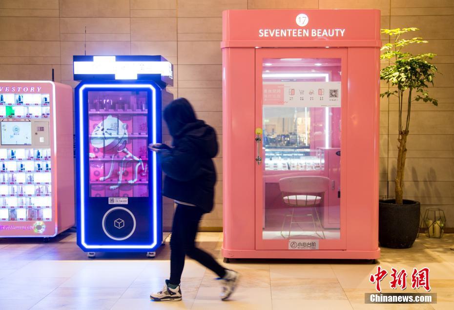 1月11日,一名顾客从“共享化妆间”前走过。武汉光谷一家购物艺术中心负一层投放了一个共享化妆间。化妆间大约有2平方米,是一个提供化妆品以及美容工具的私密空间。用户在使用化妆间前需要实名认证,扫描二维码进入。在“共享化妆间”中,粉底、眼影、睫毛膏、口红等女性化妆用品应有尽有,且很多都是国际知名品牌。目前武汉约有十个商场引进了共享化妆间。中新社记者 张畅 摄