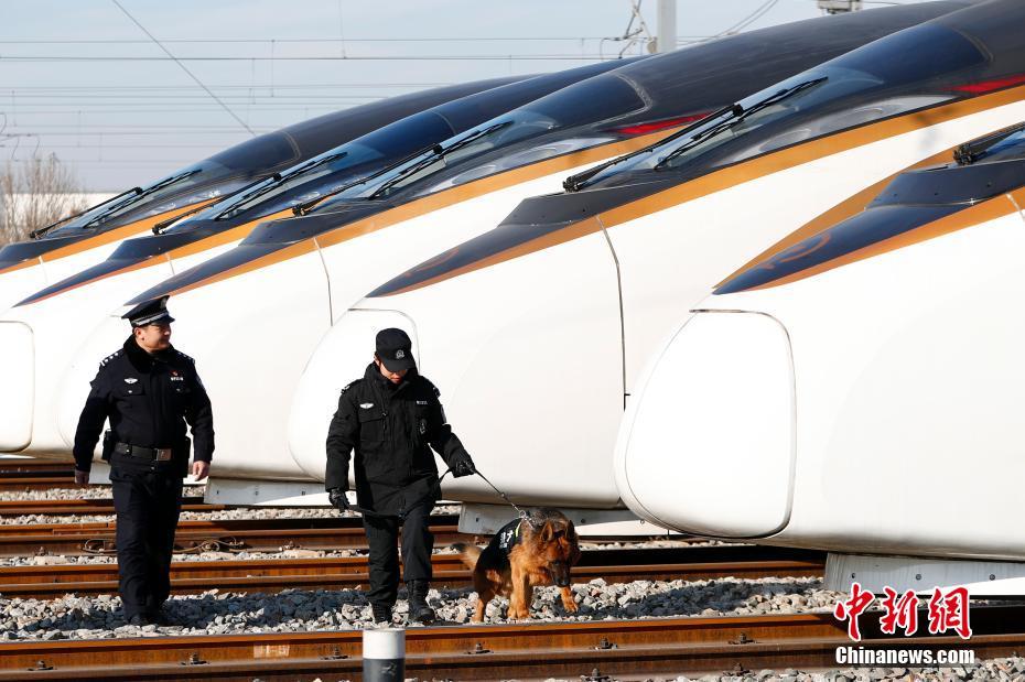 1月17日,北京铁路警方携犬在北京动车段对入库检修列车进行安全防范检查。春运临近,北京铁路警方严格各项安保措施,对入库检修的每列高铁、动车组列车进行逐车厢的治安和防火检查,确保车厢内无可疑人、可疑物,确保列车车体安全。中新社记者 富田 摄
