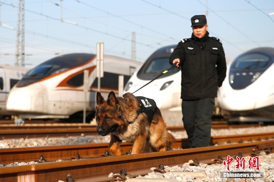 1月17日,北京铁路警方携犬在北京动车段对入库检修列车进行安全防范检查。春运临近,北京铁路警方严格各项安保措施,对入库检修的每列高铁、动车组列车进行逐车厢的治安和防火检查,确保车厢内无可疑人、可疑物,确保列车车体安全。中新社记者 富田 摄