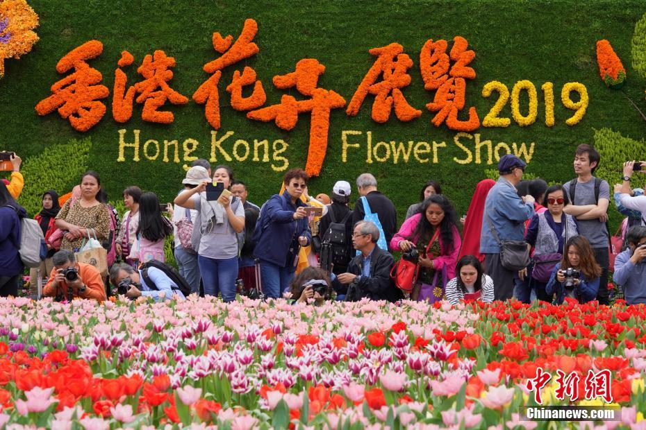 3月16日,2019年香港花卉展迎来首个周末,花卉展上百花争艳,吸引数以万计的市民和游客蜂拥而至。人潮涌动在花海中,人们在花花世界里赏花拍花,享受春天的美丽与喜悦。今年花展以“大红花说愿”为主题,大红花(朱槿)成为今次花展的主角。预计今年花展将吸引大约70万人次入场。图为郁金香花海和主题花墙。中新社记者 张炜 摄