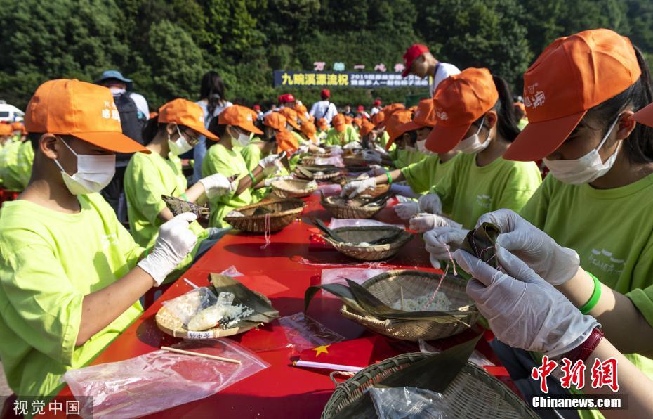 6月3日,湖北宜昌,在秭归县屈原故里文化旅游区,当地居民、中小学生与游客在屈原祠广场参加“最多人一起包粽子”吉尼斯世界纪录挑战赛活动(无人机拍摄)。林森 摄 图片来源:视觉中国