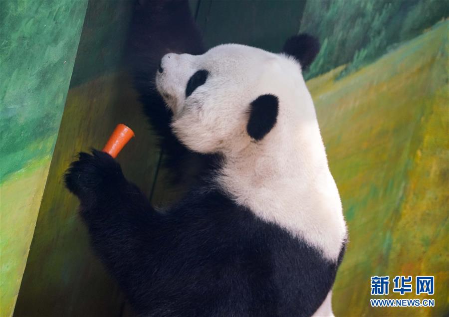7月18日,大熊猫思嘉在熊猫馆中吃食物。 新华社记者王松摄