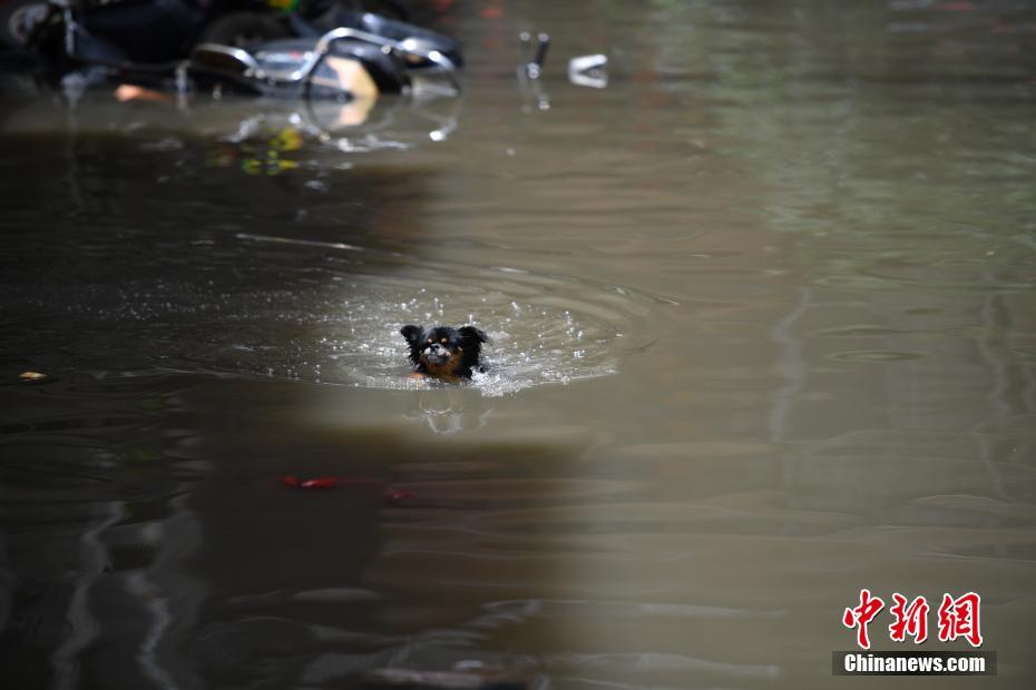 7月20日,一只小狗在积水中游泳。当日,昆明市主城区出现大到暴雨天气,多处路段出现淹积水,车辆与行人通行受影响,最深处积水达80厘米。中新社记者 刘冉阳 摄